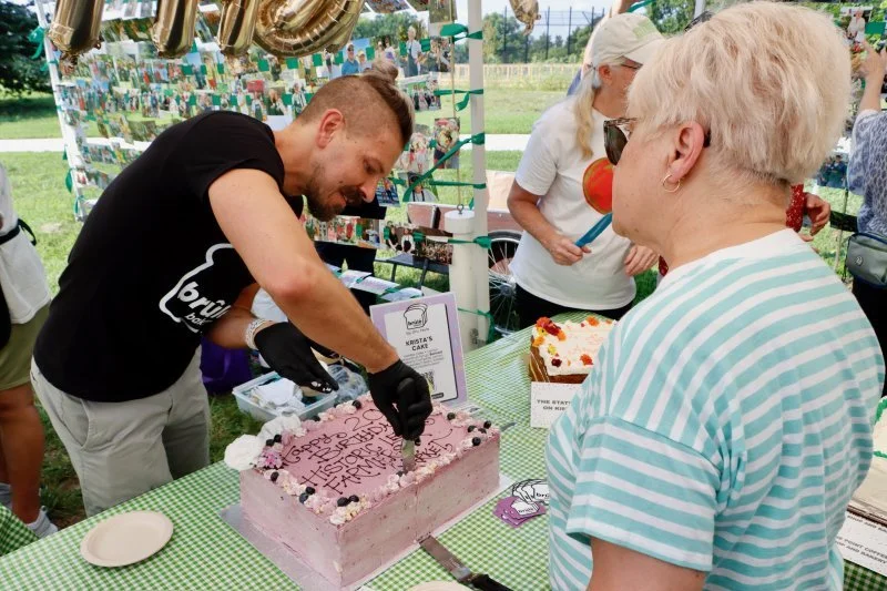 Dru Tevis of Brûlé Bakery cuts his cake during the HLFM’s celebration. Tevis was one of five vendors who contributed cakes for the celebration.